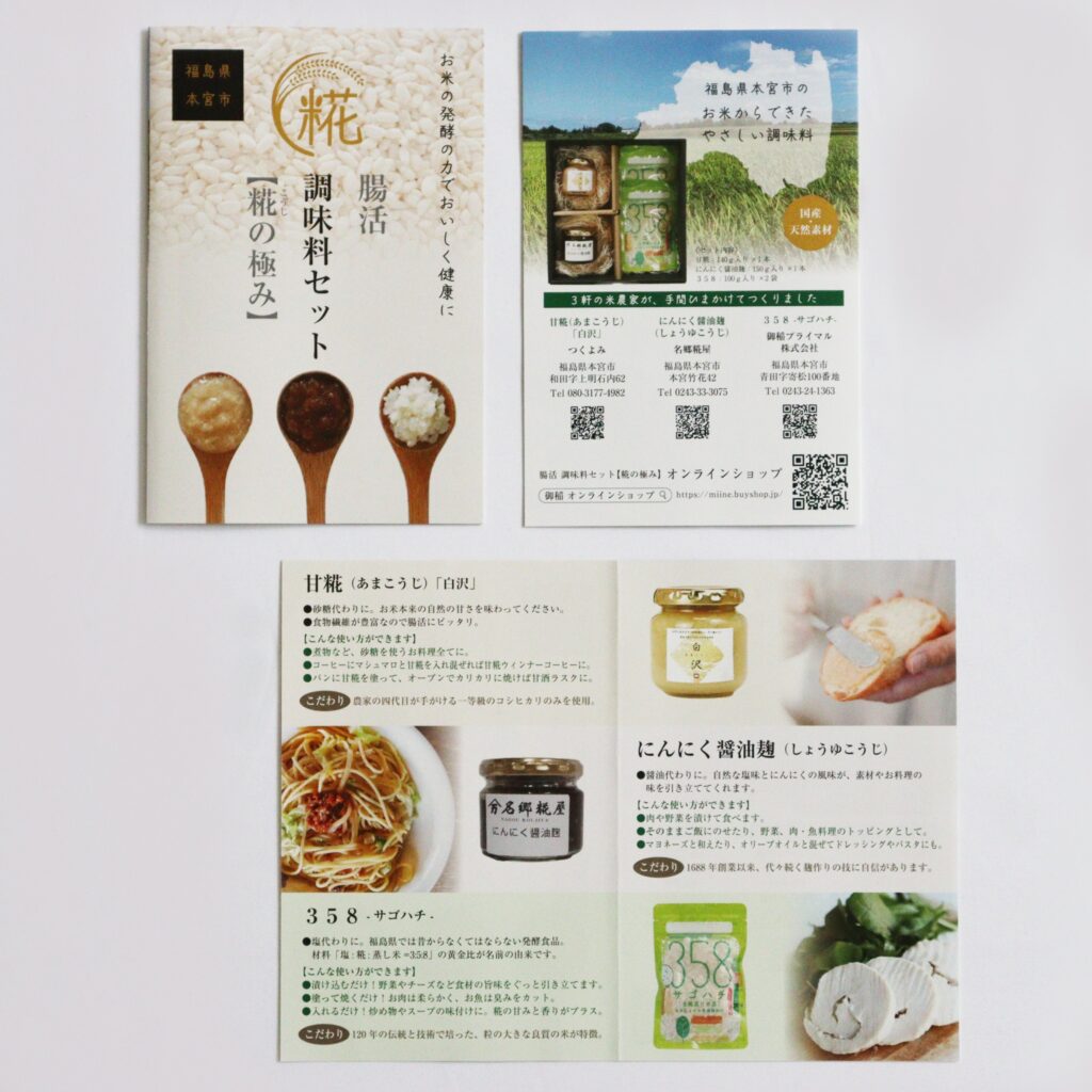 その鹿野さんを含む農家さん3軒の作った新商品「腸活調味料セット」のリーフレットと包装紙(掛け紙)を作成させていただきました。