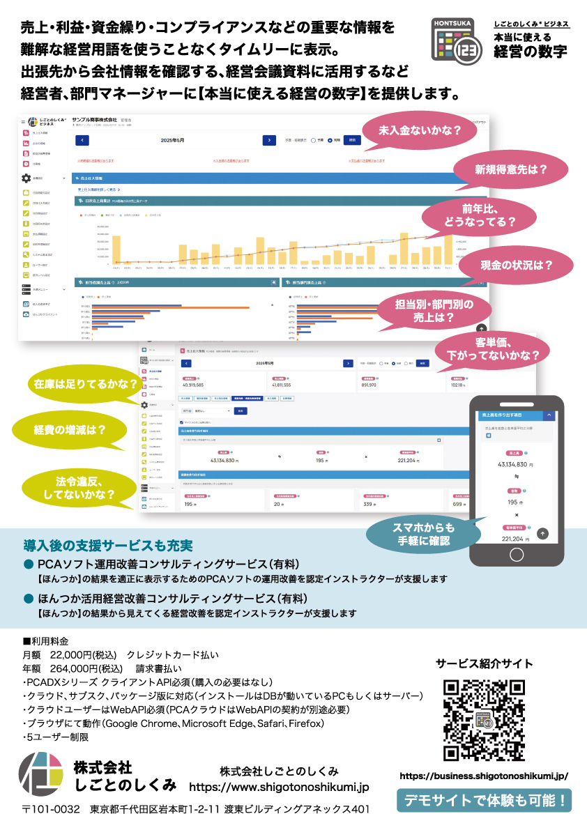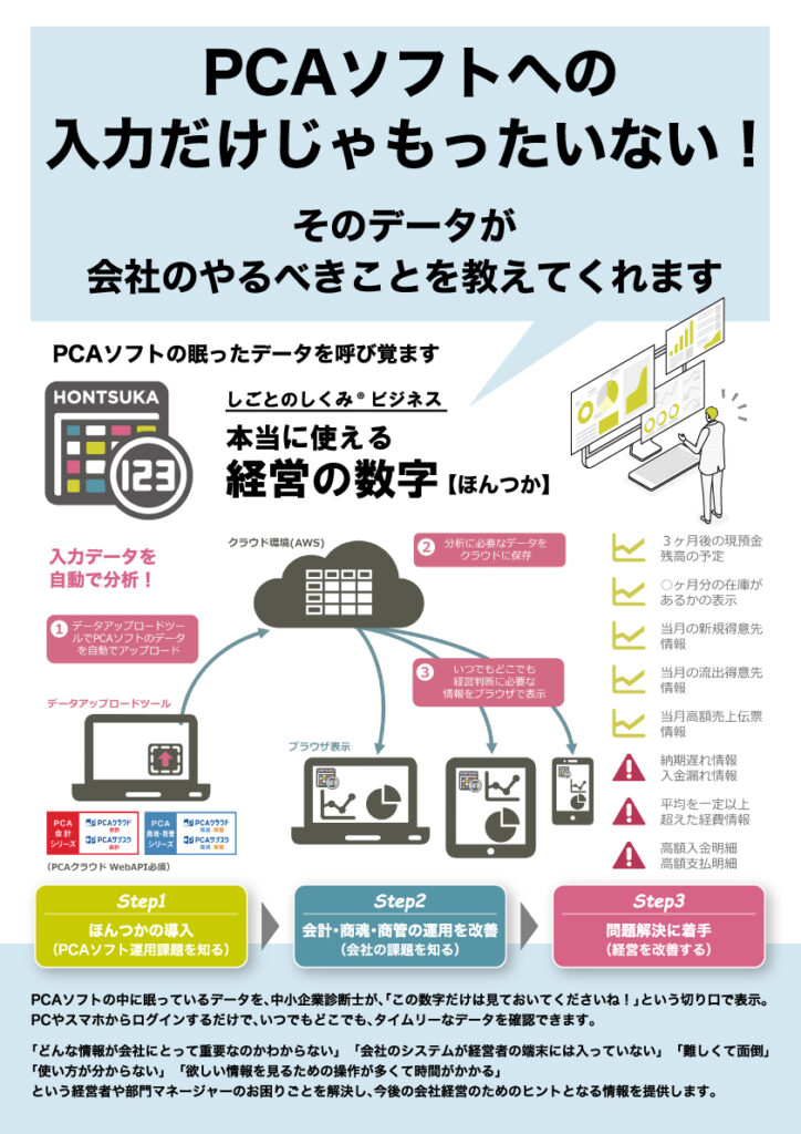 こちらは、会計・販売管理・人事給与などバックオフィス業務をサポートする、ピー・シー・エー株式会社の基幹業務ソフトの入力データを、中小企業診断士が「この数字だけは見ておいてくださいね!」という切り口で表示するというシステム。