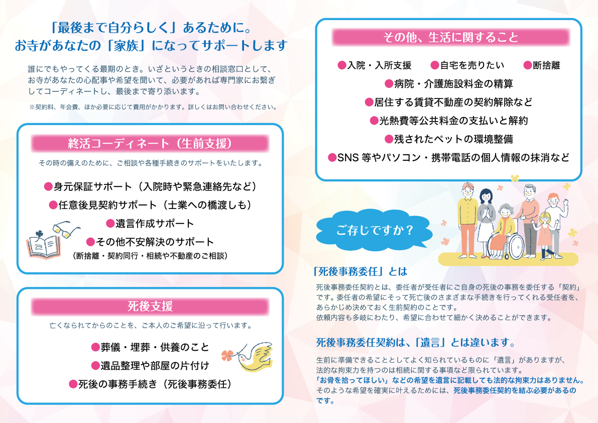 そんな「生前支援」「死後支援」「生活支援」などを、必要に応じて士業のプロとも連携を取りながら、お寺としてサポートしてくれるこのサービス。
