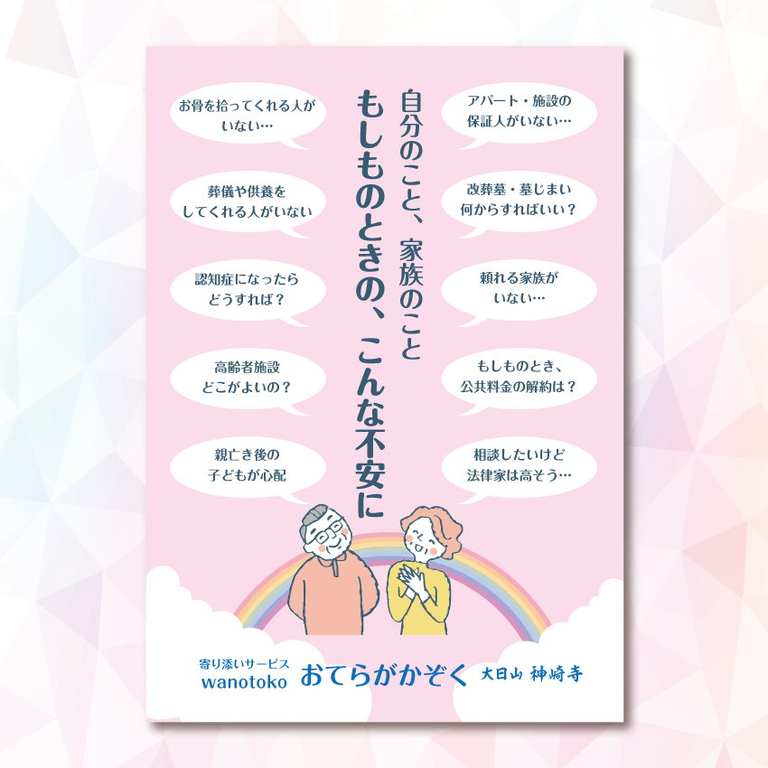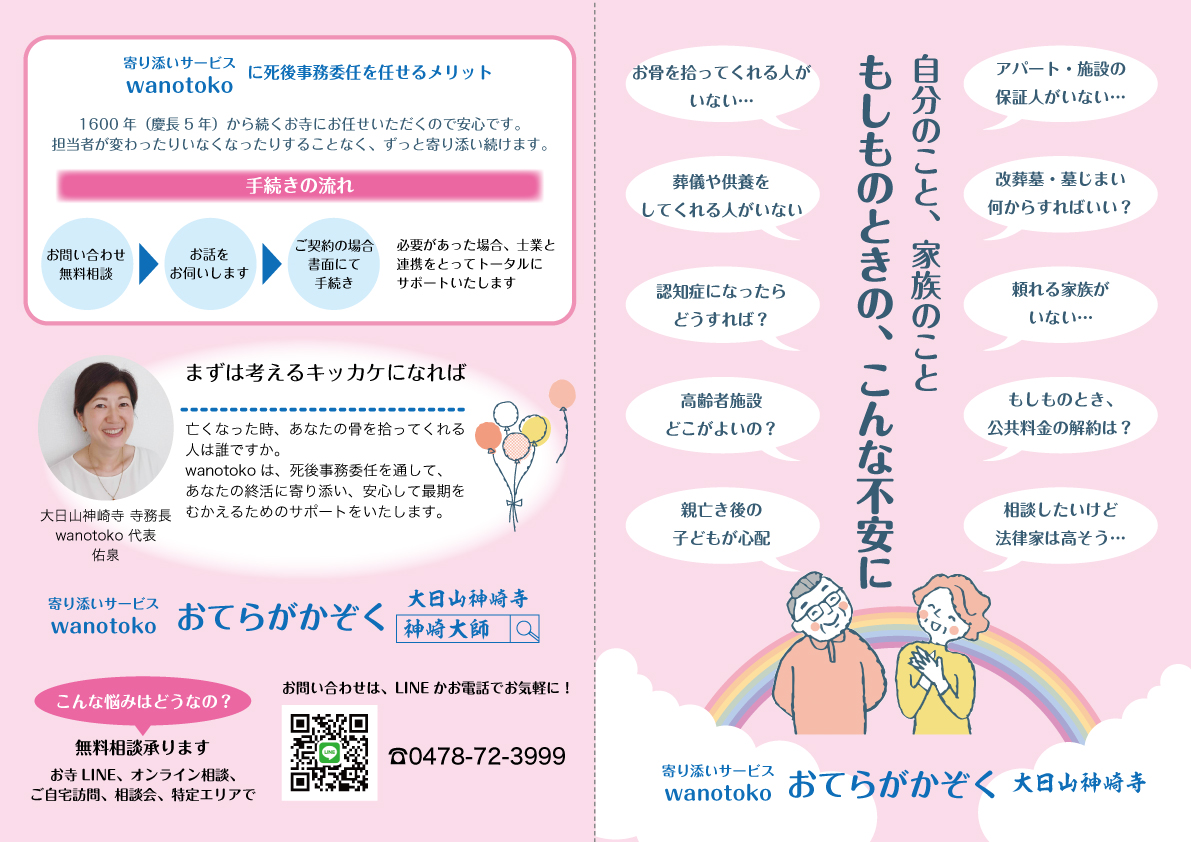 そんな佑泉さんが、お寺へ寄せられる多くの声に耳を傾け、必要だと感じたというのが 寄り添いサービスwanotoko『おてらがかぞく』。