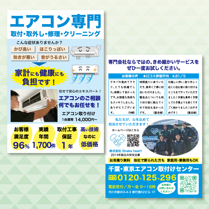 株式会社 Shake heart『千葉・東京エアコン取付けセンター』 加々谷 隆司 様のご依頼で販促ハガキを作成させていただきました♪
