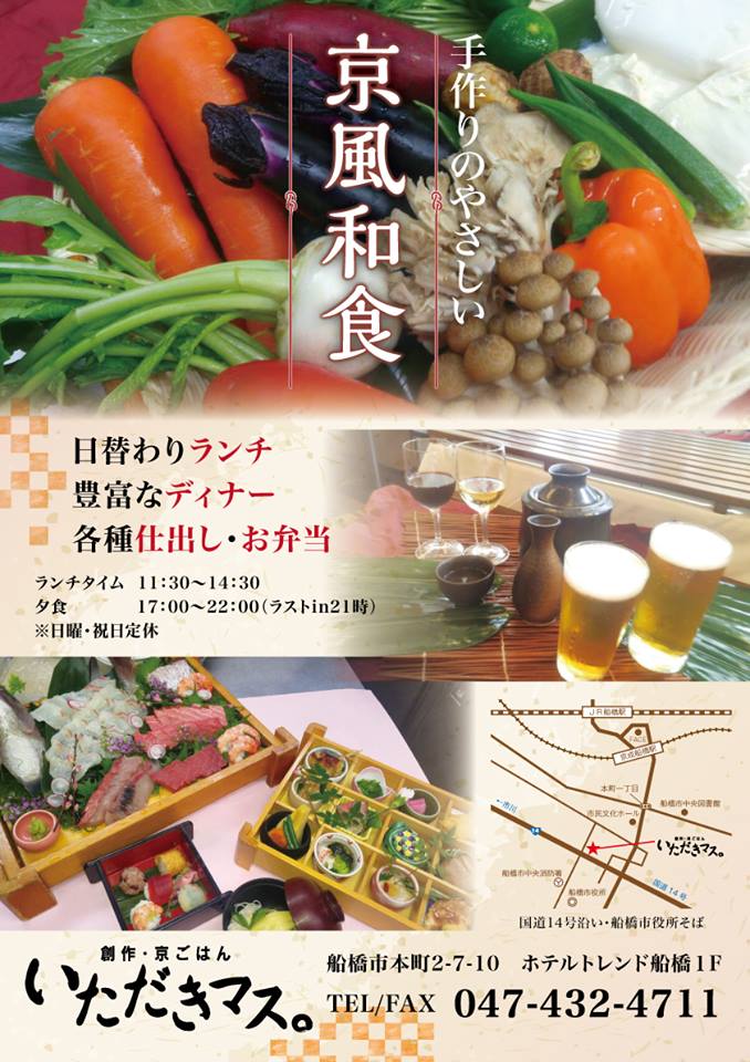 こちらの1Fにある 創作・京ごはんのお店『いただきマス。』さんのチラシ・ポスターを作らせていただきました。