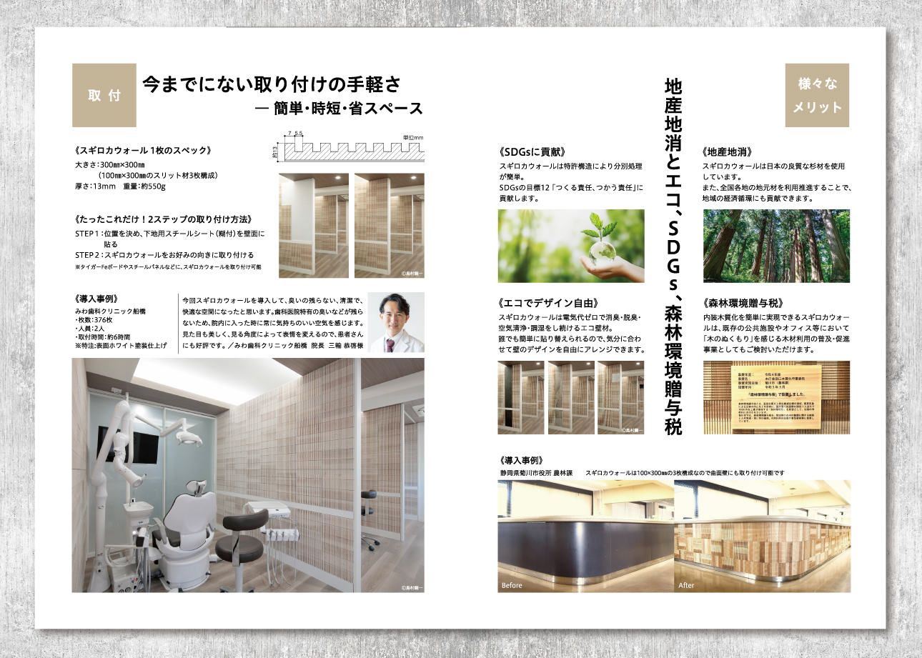 さらにパンフレット内の「施工例」では、実際にクリニックでこの壁シートを使って患者さんからの評判も良いという、みわ歯科クリニック船橋の院長