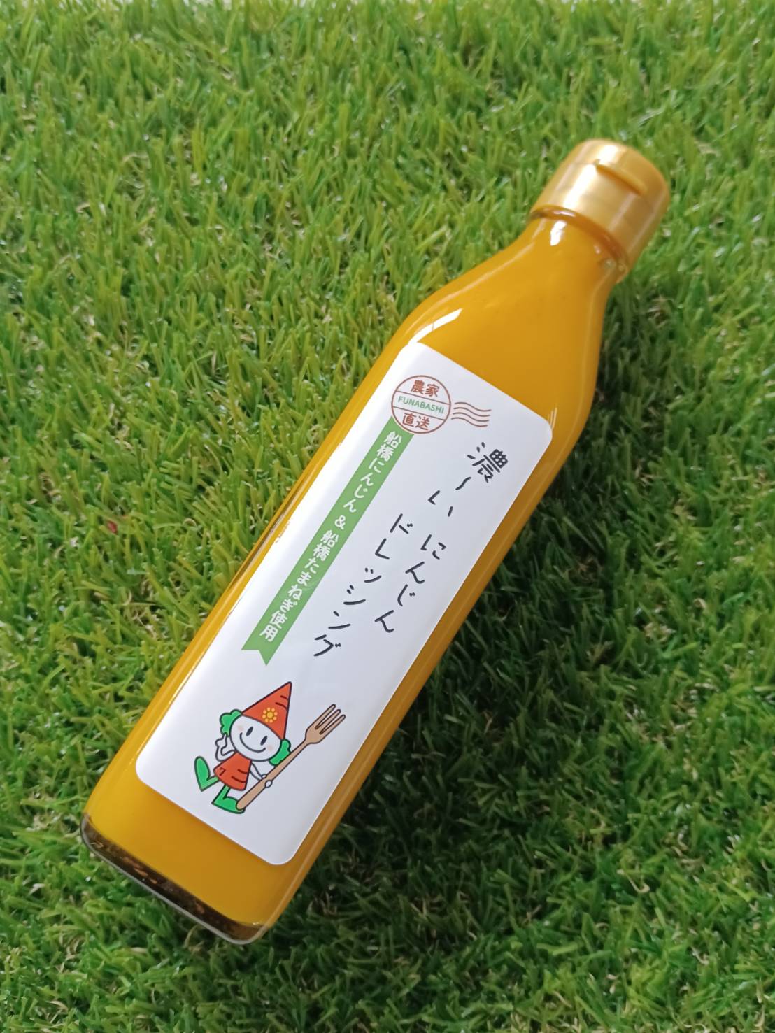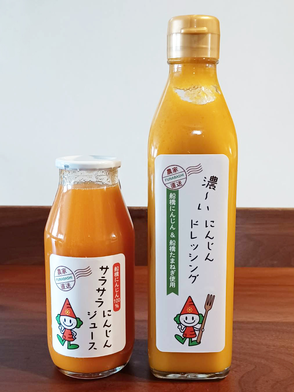 『船橋にんじん』の にんじんジュースとドレッシングのキャラクターデザインや商品ラベルを担当させていただきました。
