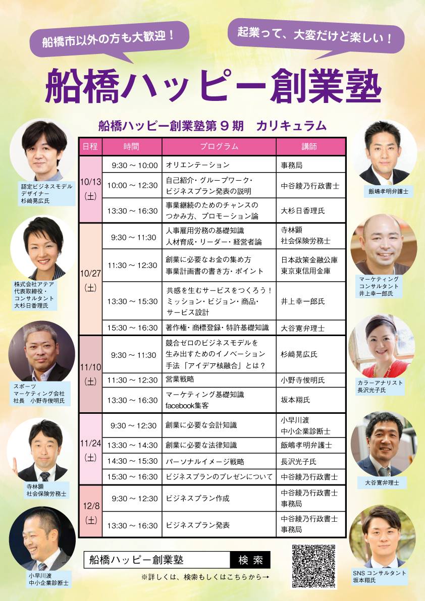 船橋商工会議所主催/NPO法人なでしこ協力「第9期 船橋ハッピー創業塾」が秋に開催されます♪ まさかの価格で起業のスペシャリストのお話が聞けるのはもちろん、 一緒に切磋琢磨できる起業仲間ができる場は、とっても貴重です!