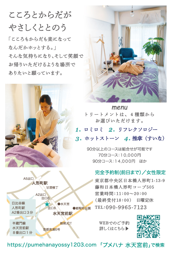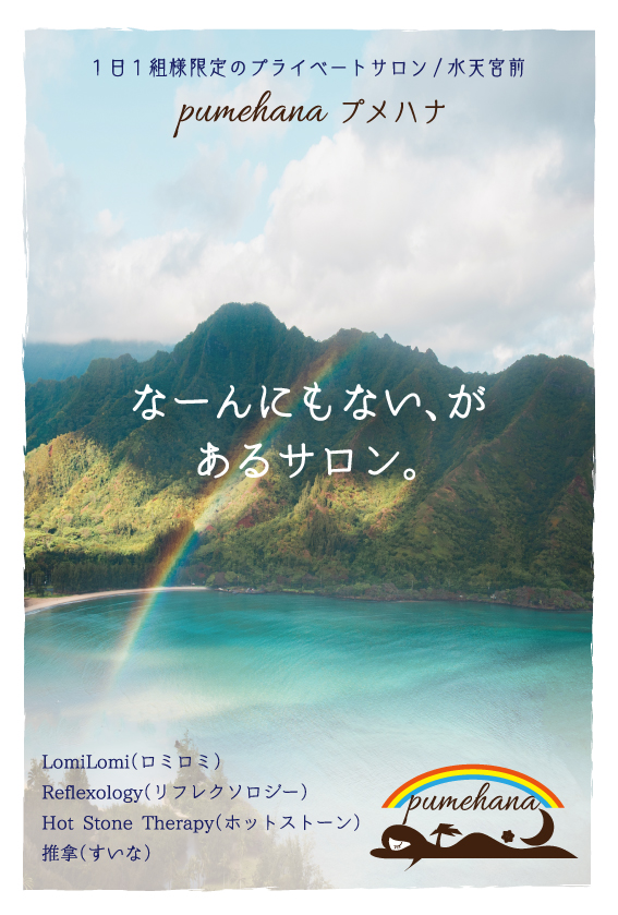 超贅沢な時間のなかで、ロミロミ・リフレクソロジー・ホットストーン・推拿(すいな)などの施術が受けられる『プライベートサロン pumehana(プメハナ)』様のハガキや名刺を作成させていただきました。