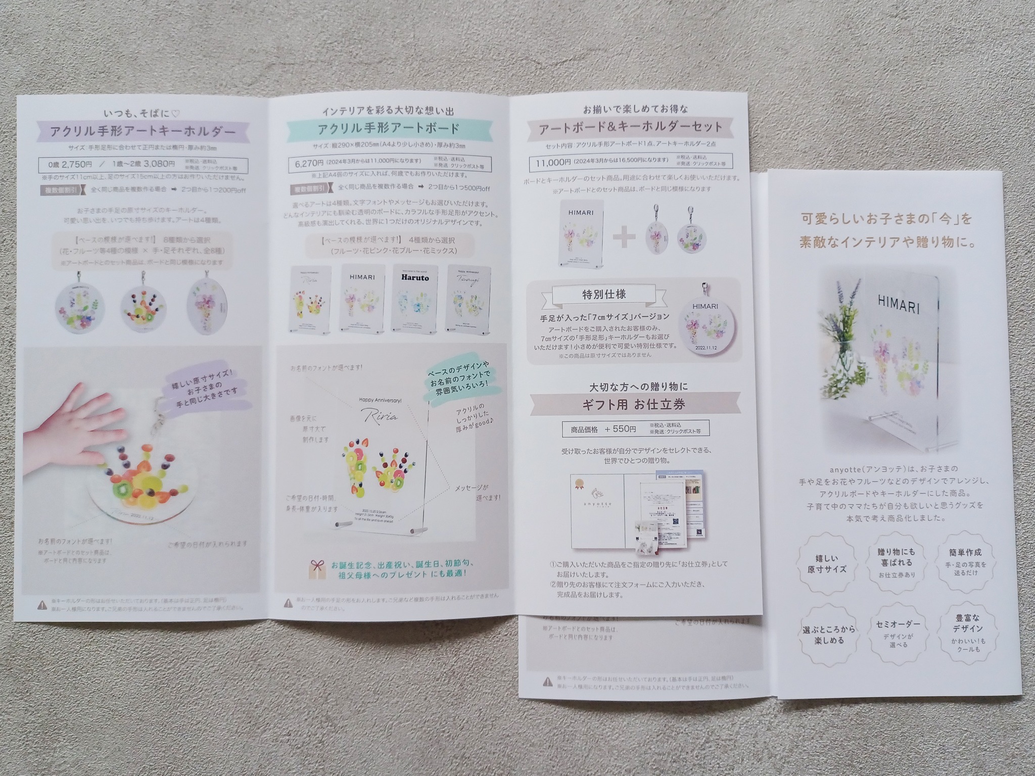 お子さまの手や足の画像を送ってデザインを選んだら、超素敵なアクリルボードやキーホルダーになっちゃうという、世界にひとつだけの商品✨
