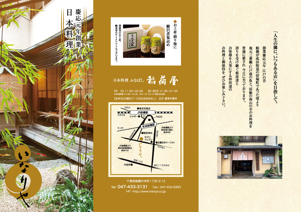 慶応元年創業、150年以上も続く船橋の老舗「稲荷屋」様のリーフレットを作成させていただきました。